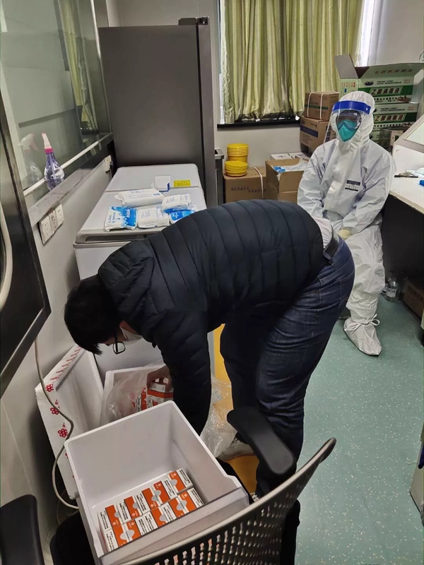 圣湘生物捐赠的第一批医疗设备、试剂以及配套耗材,顺利抵达武汉。与当地合作商一起,装运货物入库。